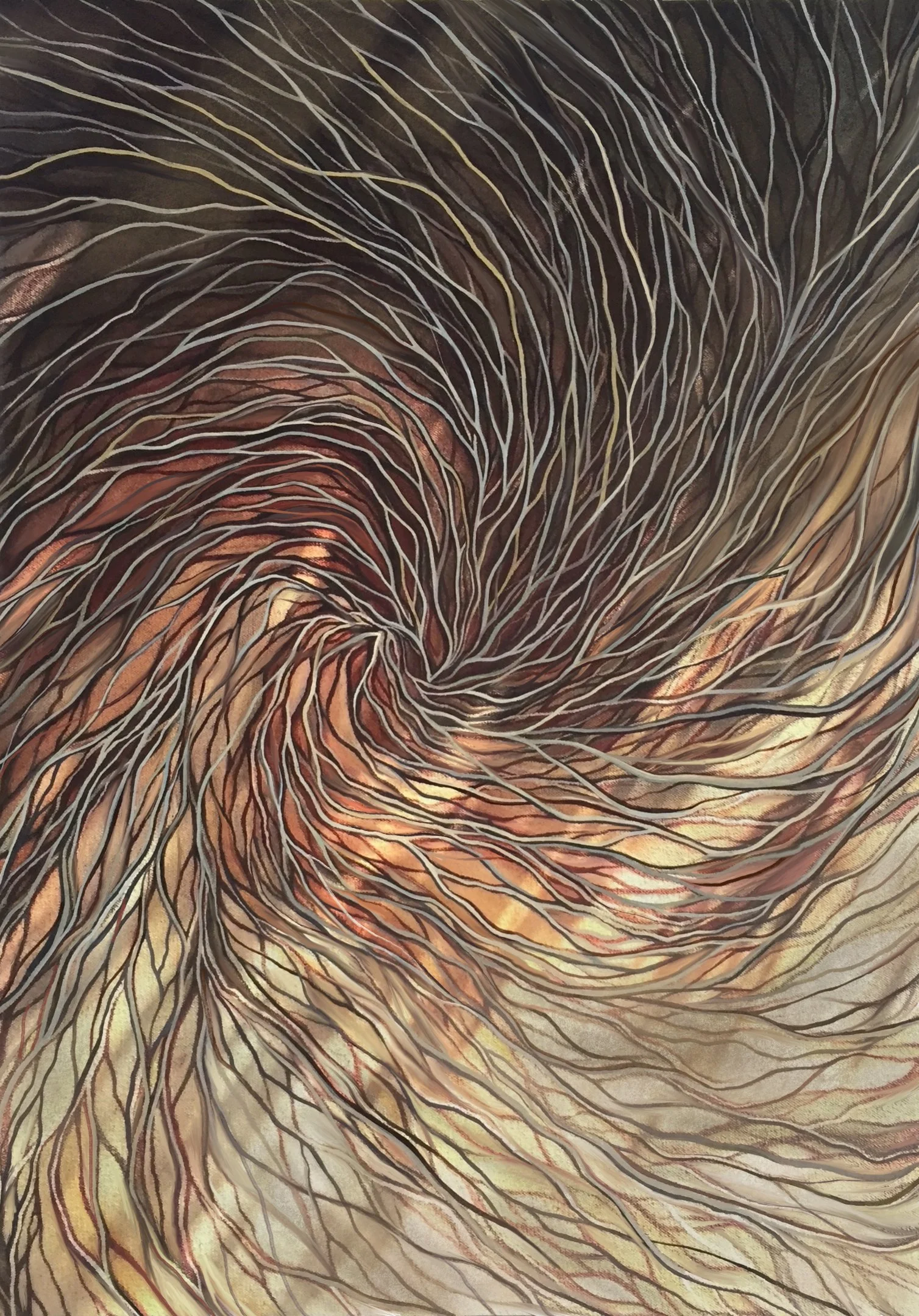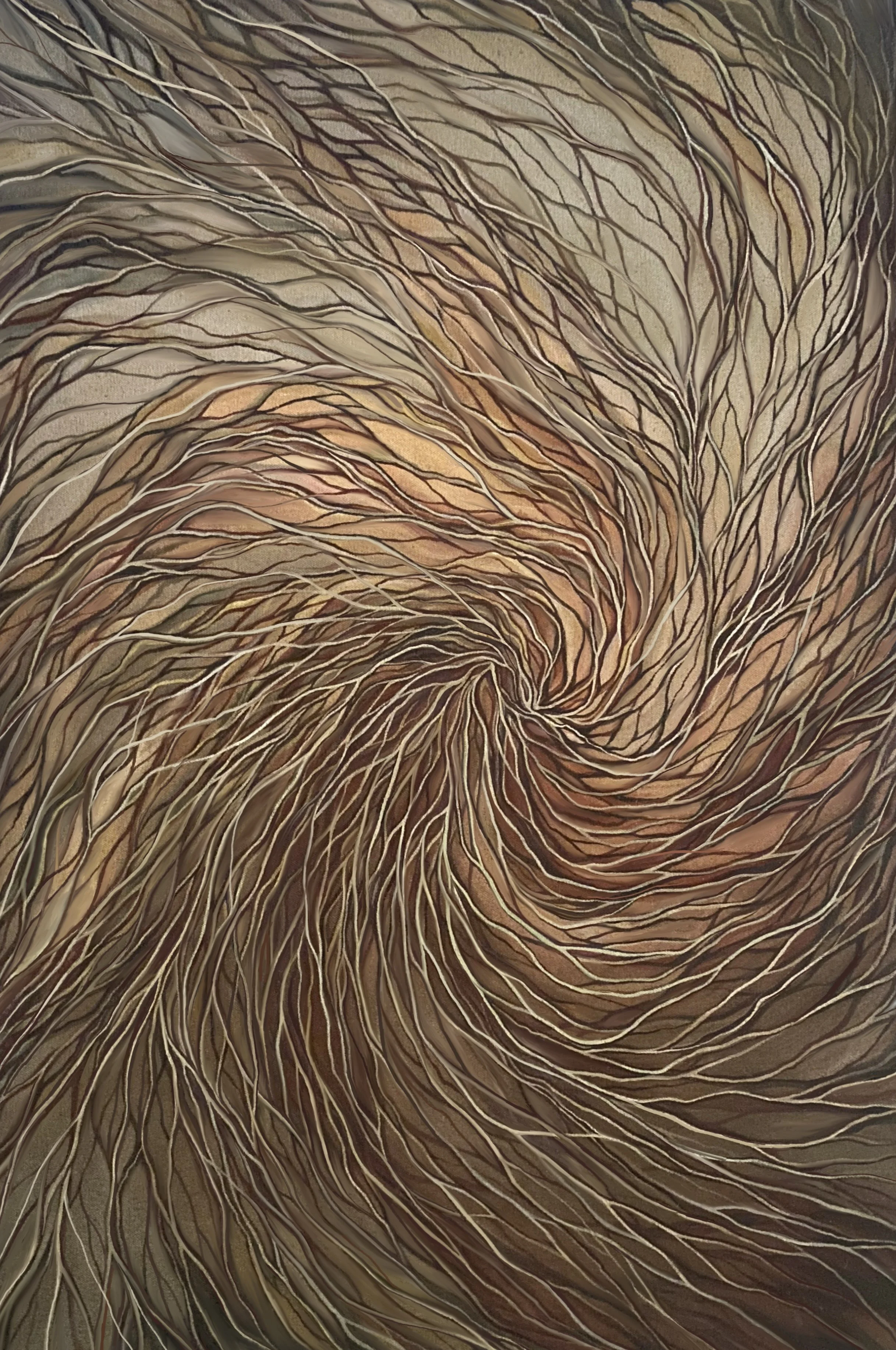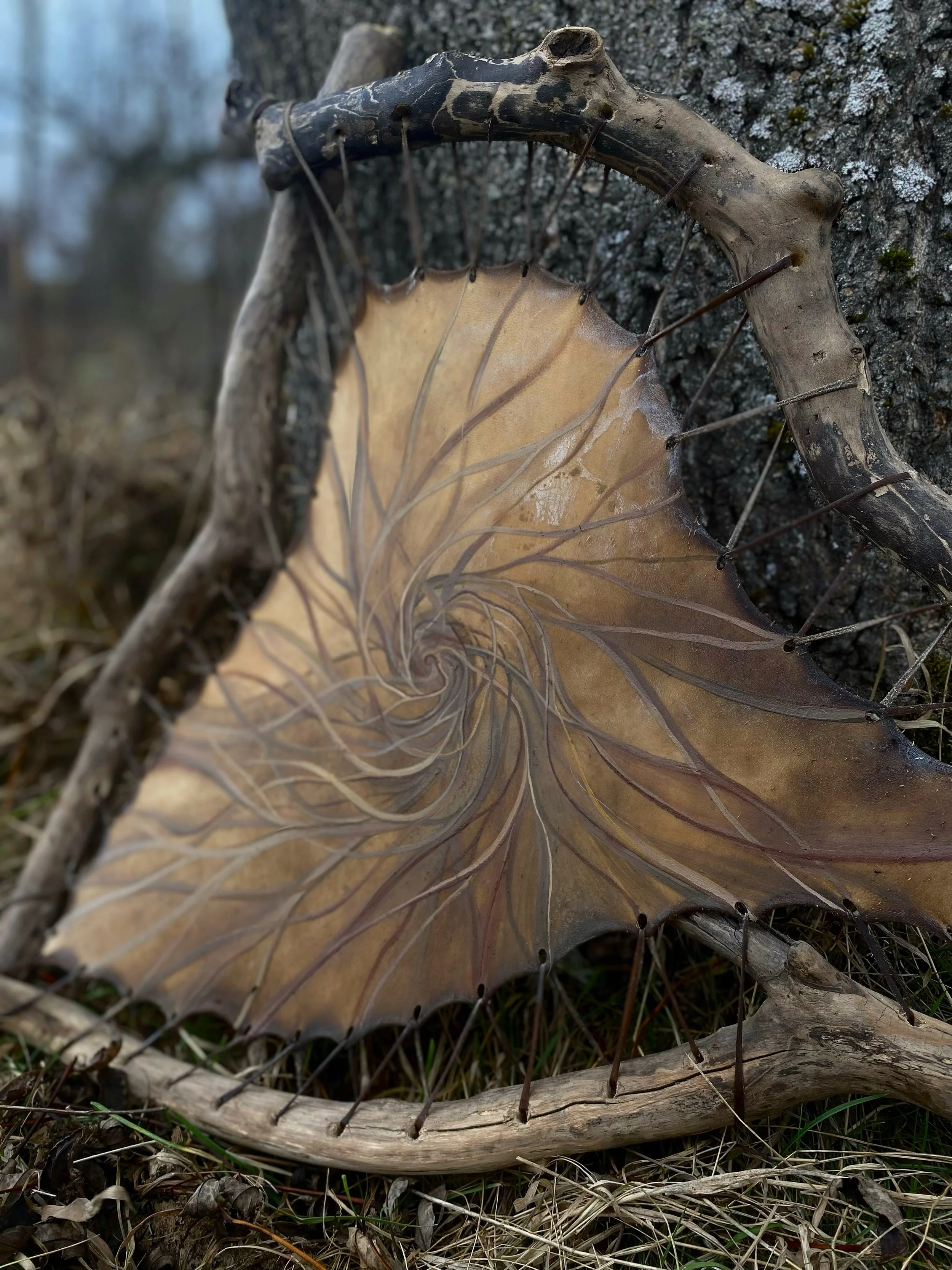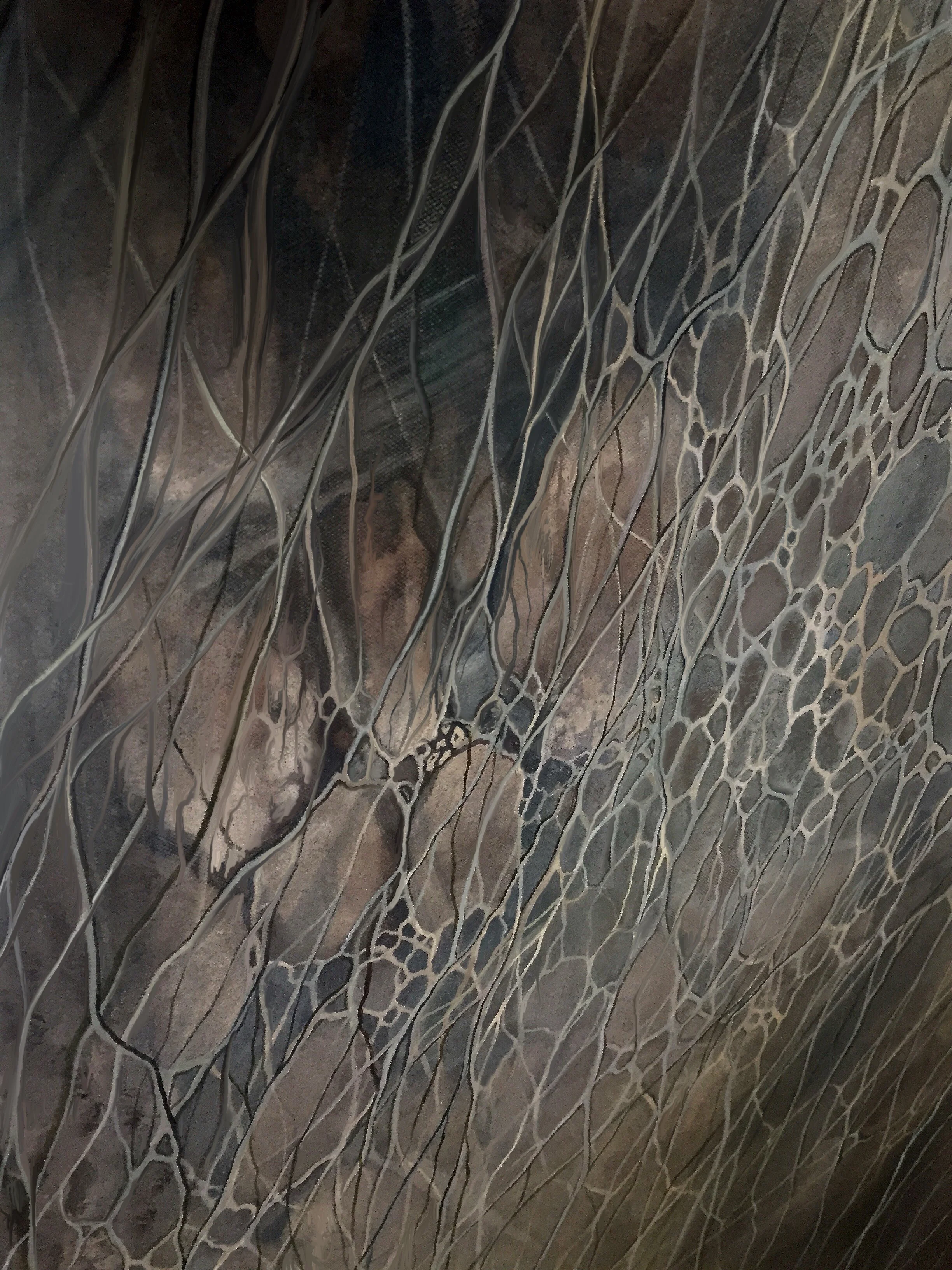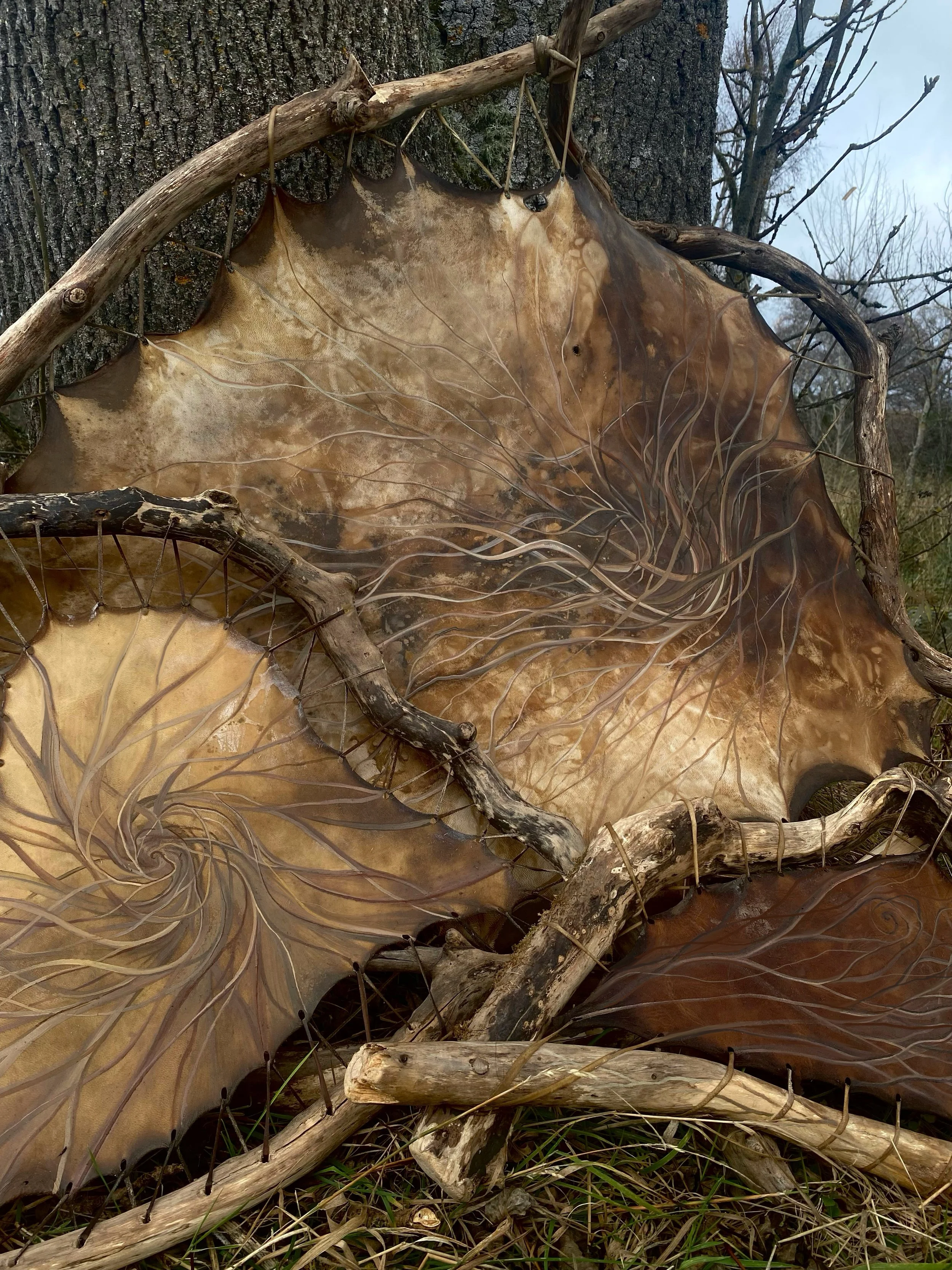 Each painting is a living alchemy of animal hide, herbal infusions, plant dyes, tree barks, wild pigments and crushed minerals - An embodied conversation with materials filled with animistic materiality.