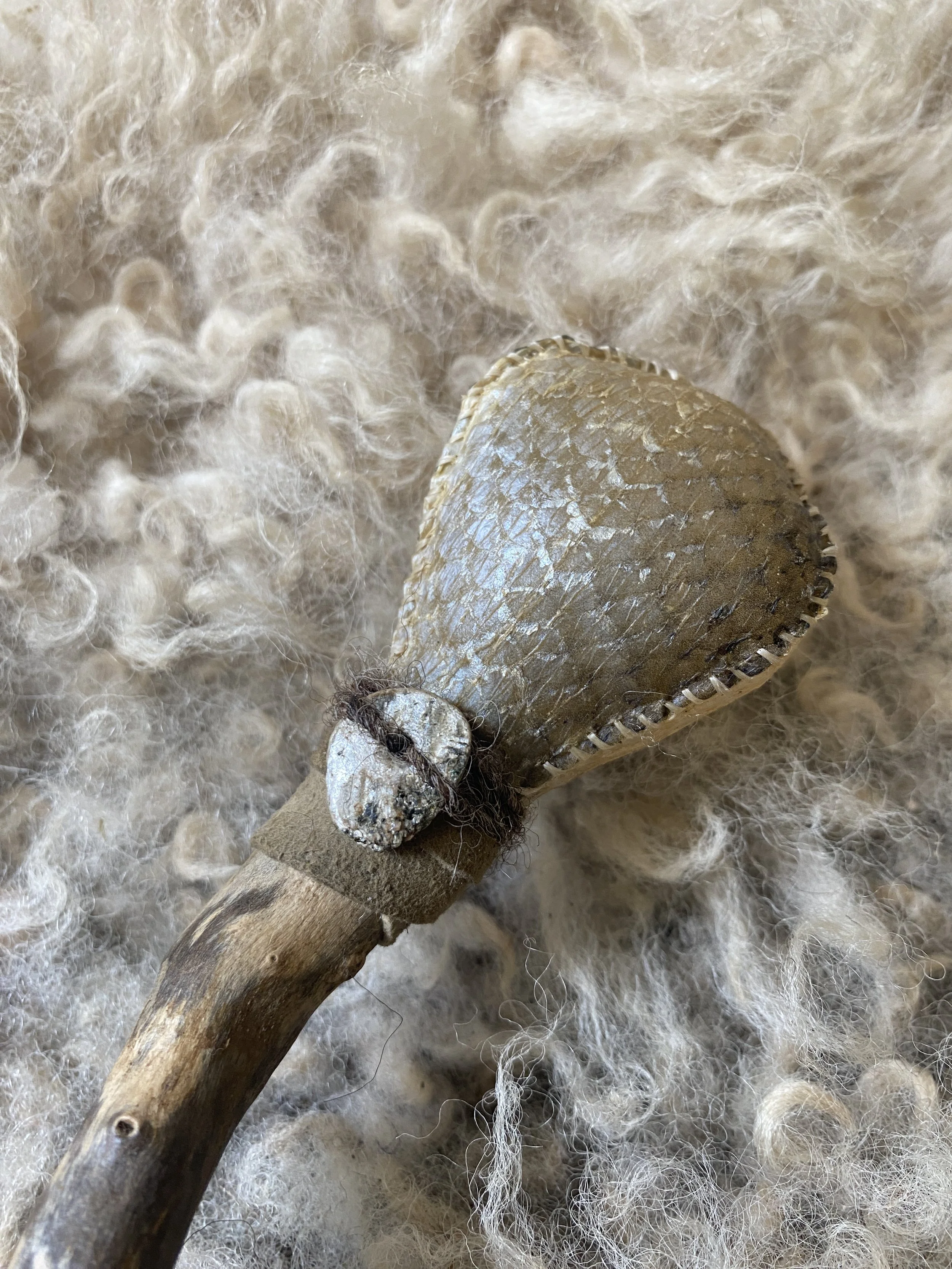 Rattles made from rawhide and furs which I've tanned myself using traditional and natural methods ~ Made using antler, bone or wooden handles, and filled with seeds or river stones.