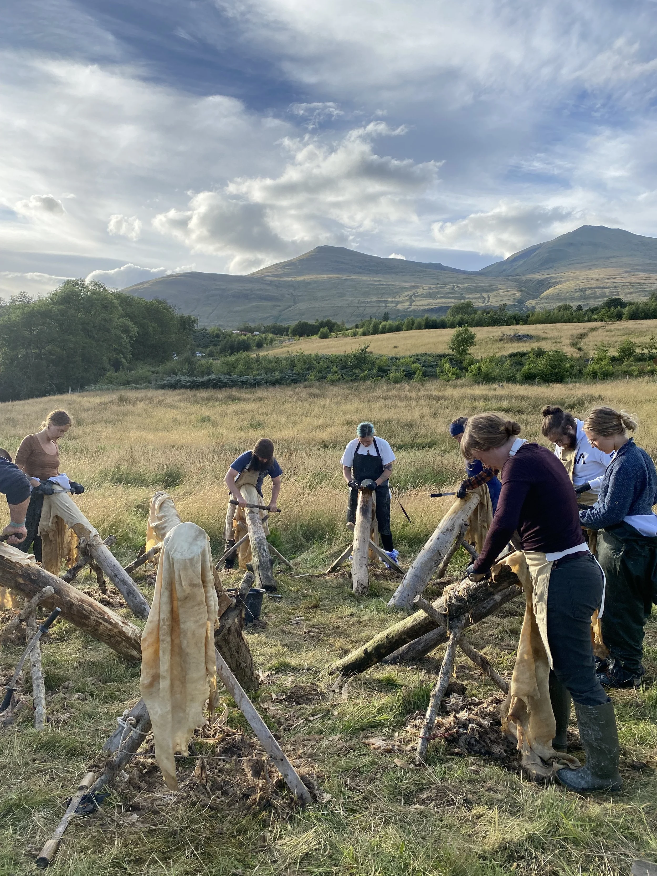 Myself and my partner run a small traditional tannery here in the Highlands, one of Scotland’s last Tanneries to produce bark tanned sheepskins and deer leather. We transform raw animal skins into functional leather that will last a lifetime and beyond - hides which, as a by-product of the meat industry, would usually be left to go to waste and end up in landfill. It is our deepest devotion to tend to these hides with reverence and respect, using only natural materials such as oak bark and limestone. It is these home-tanned sheepskins, deerskins and rawhide that I use to lovingly craft from, and paint onto.